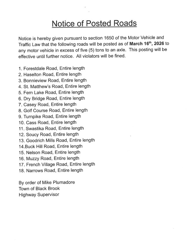 Please see the notice below from Highway Superintendent Mike Plumadore regarding posted roads in the Town of Black Brook.