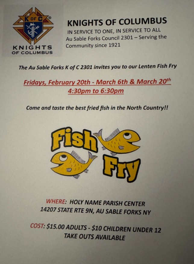 Tonight is the final Knights of Columbus Famous Fish Fry! If you haven’t had a chance to enjoy a meal yet and are able to attend, your last opportunity is Tonight at Holy Name Parish, served from 4:30 PM – 6:30 PM.